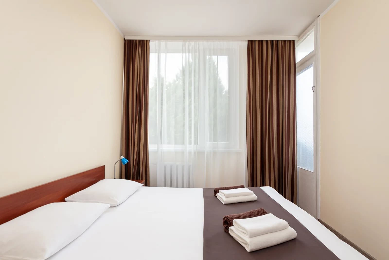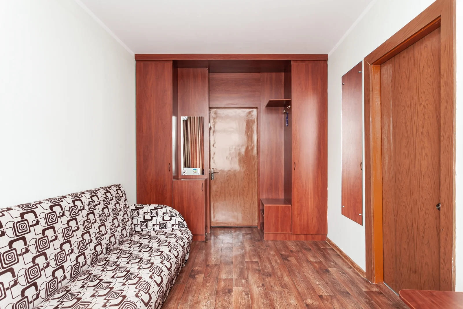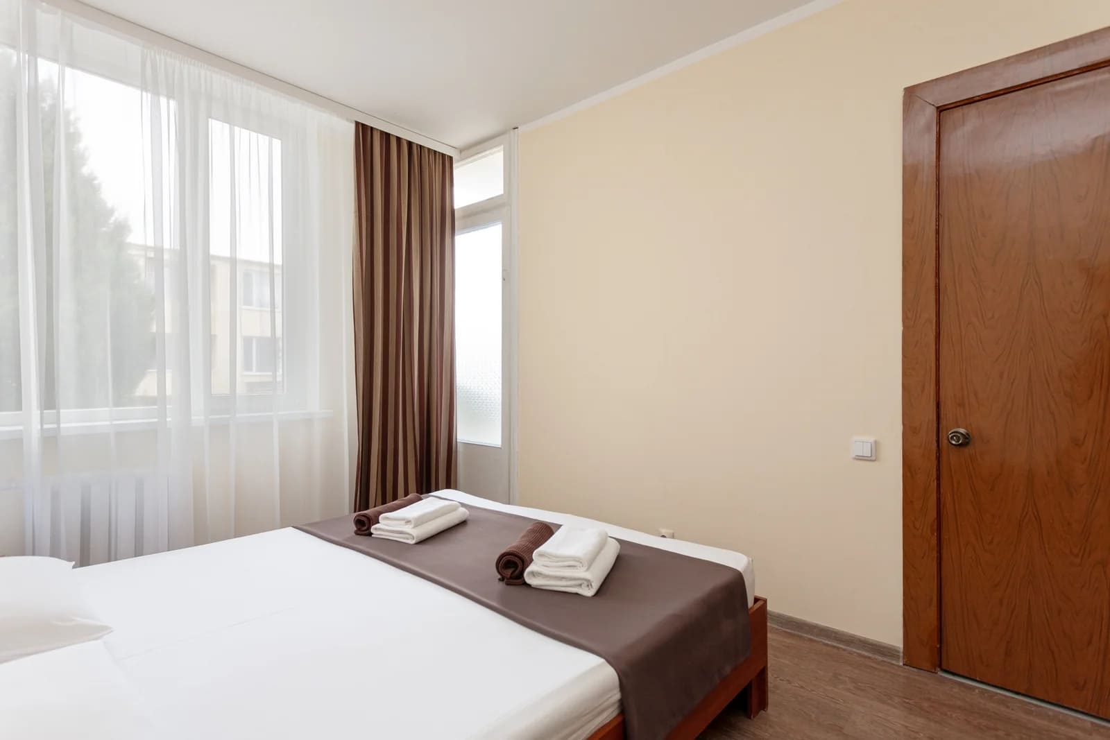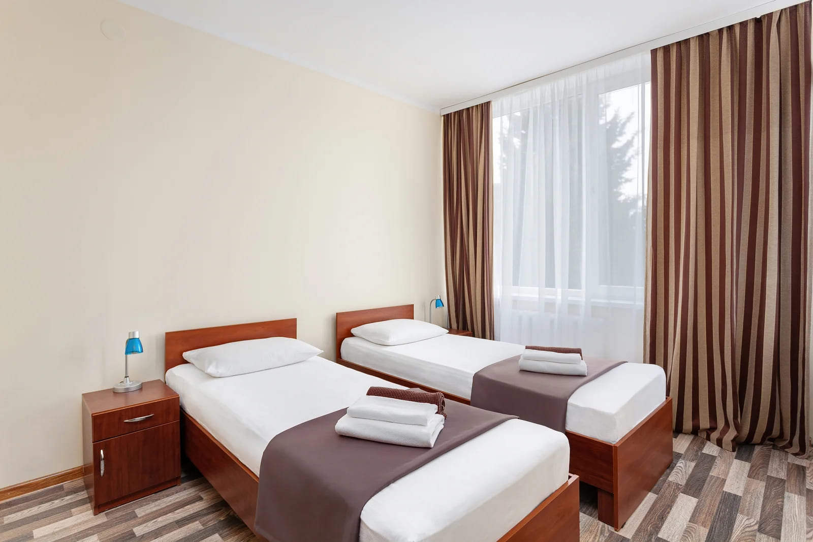 Комфортный двухкомнатный номер общей площадью 25 м2 оборудован односпальными или двухспальной кроватью для размещения, есть удобный раскладной диван. Технически в каждом номере: кондиционер, телевизор и wi-fi, фен предоставляется бесплатно по запросу.
