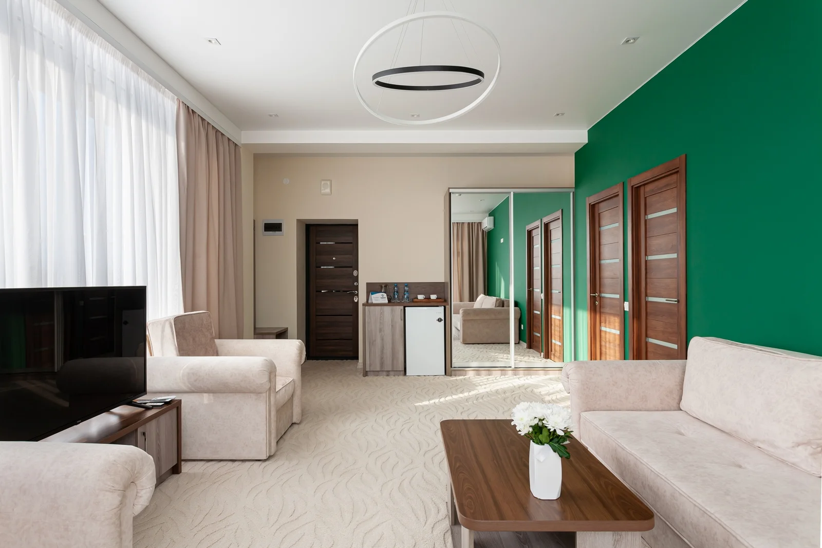Санаторий работает по системе «все включено» (проживание, «шведский стол», лечебные процедуры, развлекательная программа).